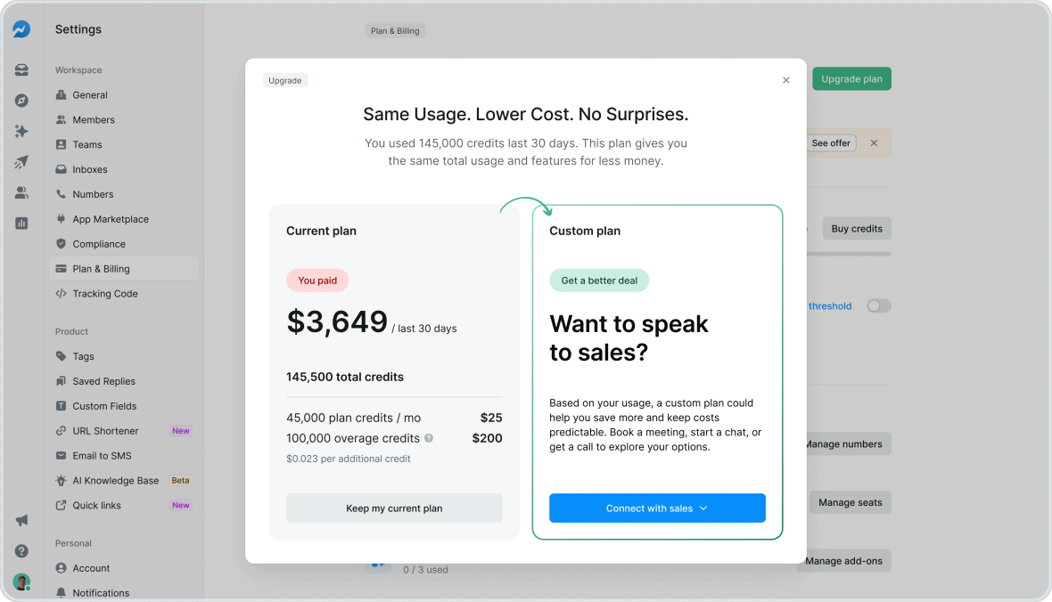 Make it easy to connect directly with the Salesmsg team when you are ready to grow. The Upgrade Opportunity modal now lets users chat, request a call, or book a meeting so they can explore expansion options, get clear answers, and move forward with confidence.