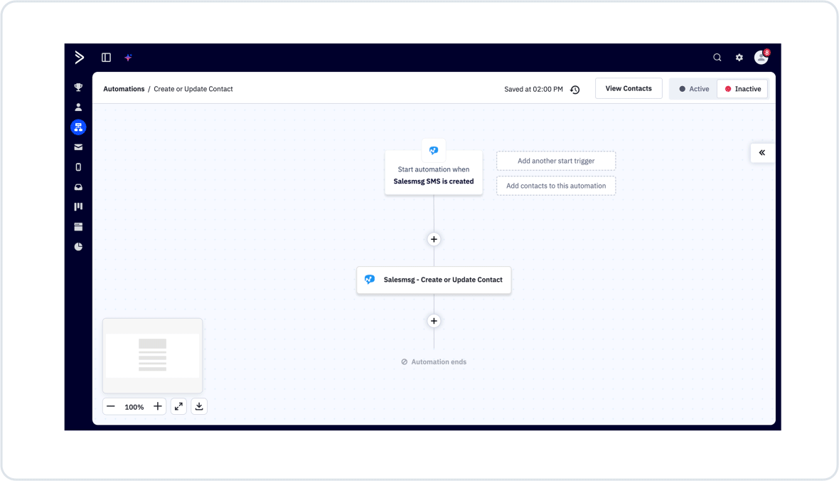 Build richer automations by creating or updating Salesmsg contacts directly from ActiveCampaign. Update contact details and apply or remove tags within your workflows to keep contact data synchronized and support more personalized messaging.