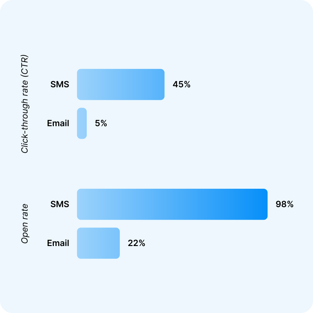 SMS has a 98% open rate, with 90% of messages read within 3 minutes of delivery. For comparison, email open rates average 20–30%. The gap comes down to delivery mechanics: SMS lands directly in the same app people use to message friends and family, without spam filters or inbox management in the way.