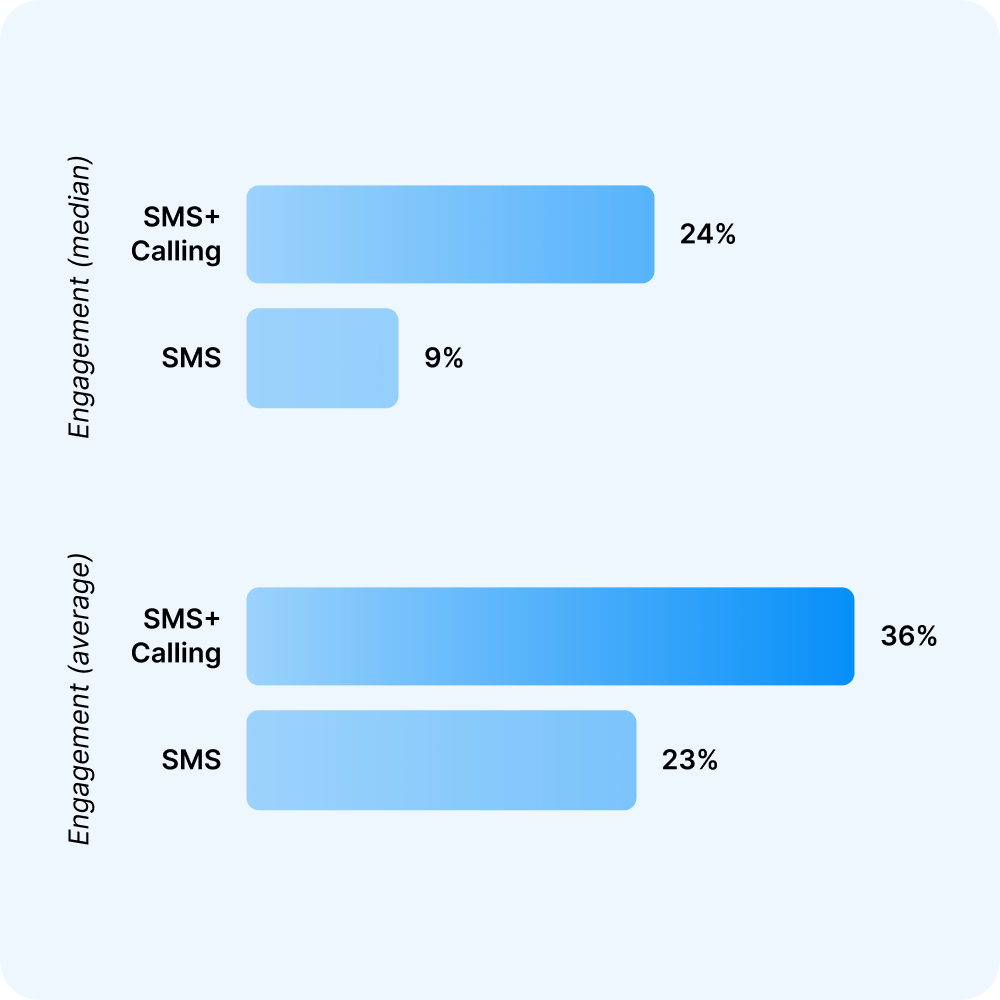 Yes, significantly. Businesses pairing SMS with calling see a median engagement rate of 24% vs. 9% for text-only. The average engagement rate jumps from 23% to 36% when calling is added to the mix. Salesmsg is one of the only platforms that handles both channels in a single shared inbox.