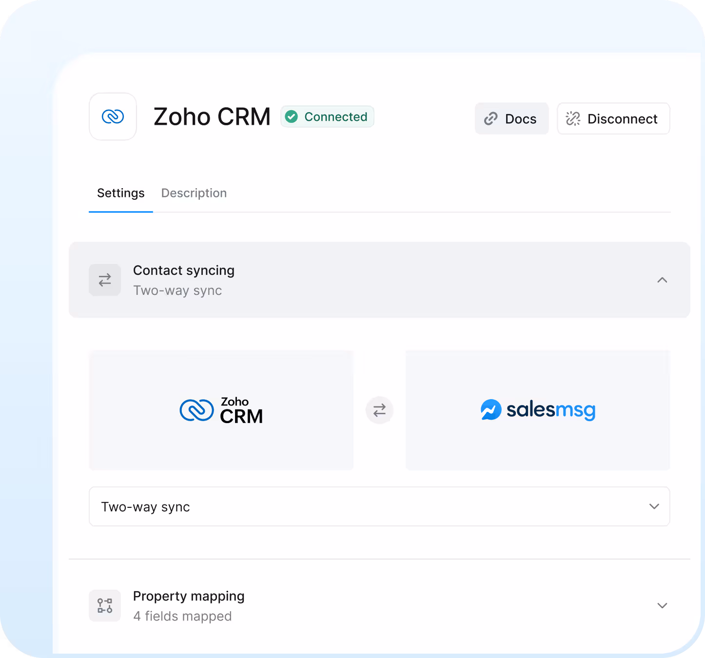 Connect Salesmsg with Zoho CRM in seconds to sync contacts automatically and enable SMS conversations for your CRM. Empower your sales team with two-way texting capabilities while maintaining complete visibility of customer communications.